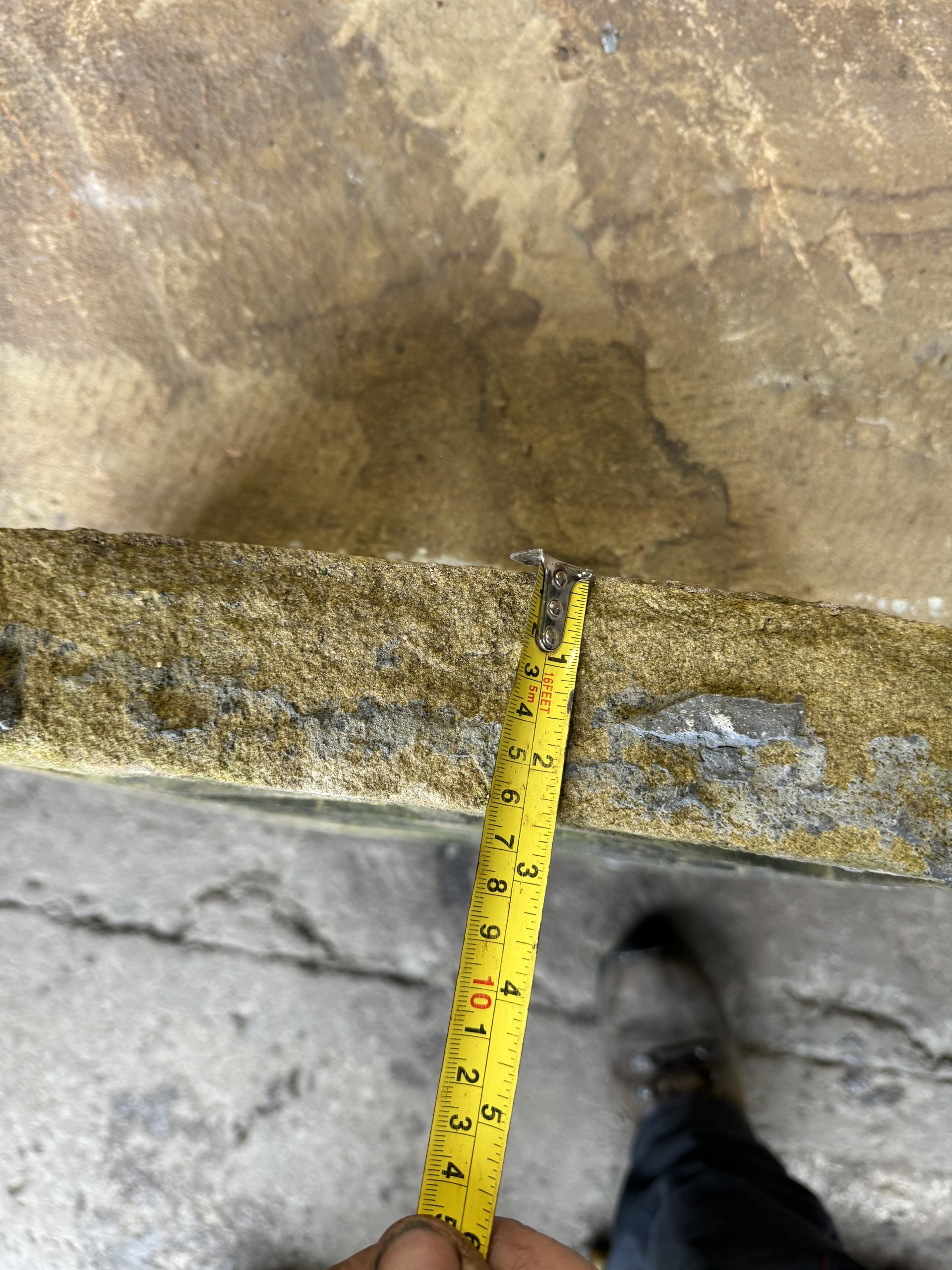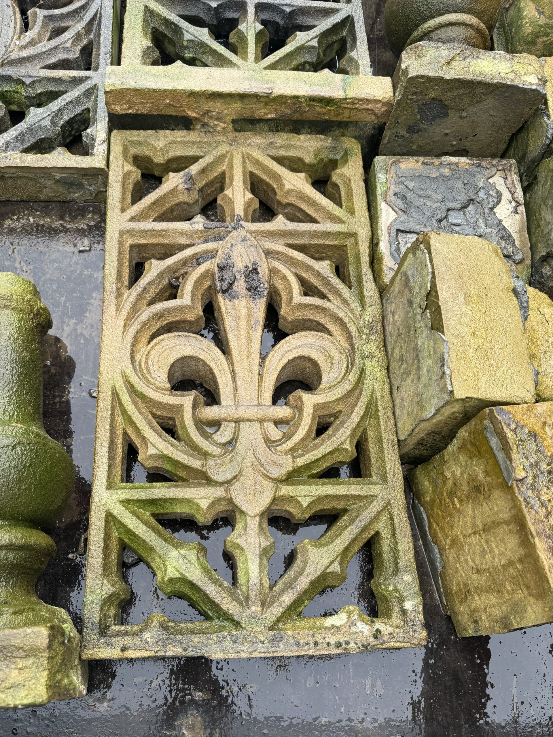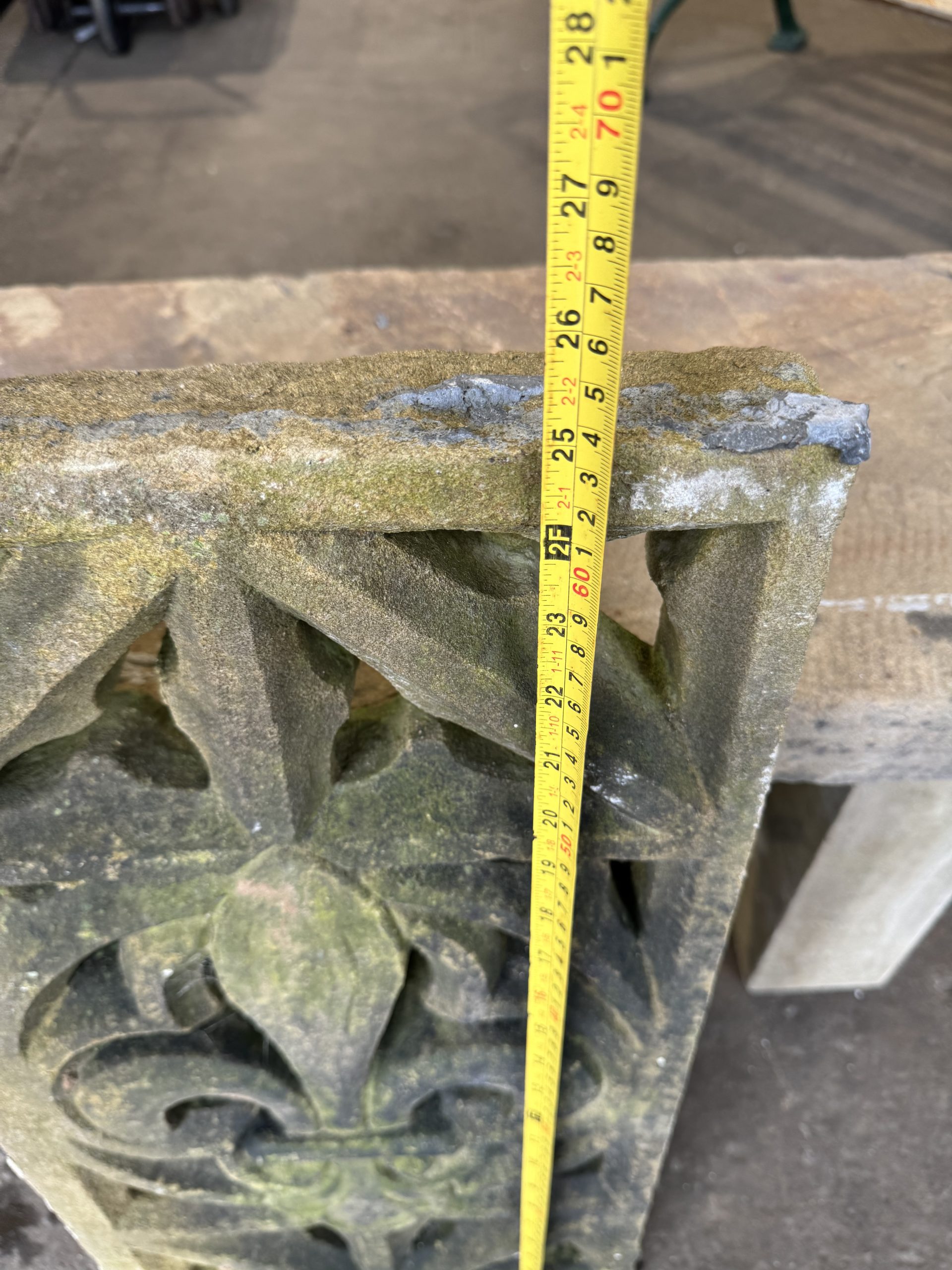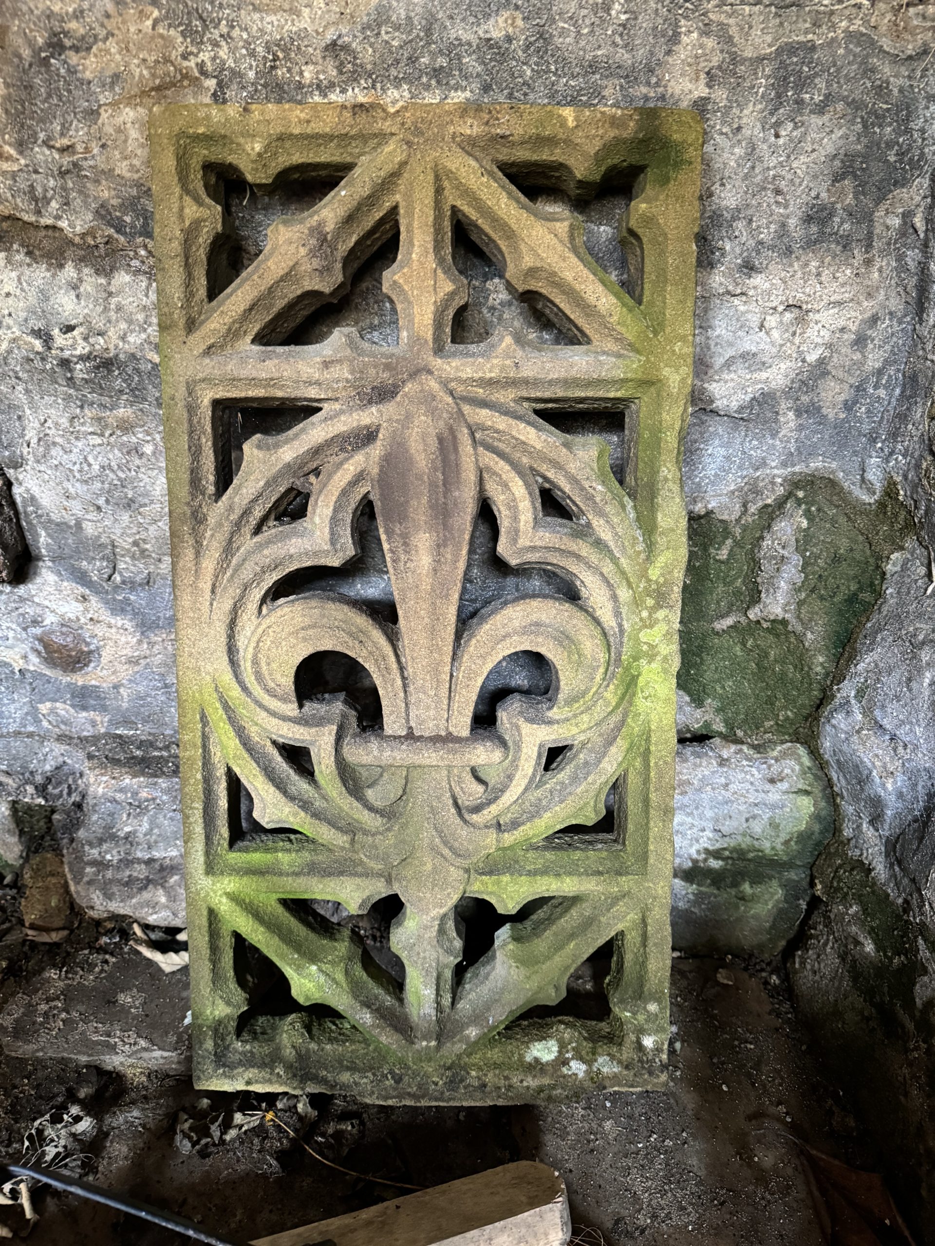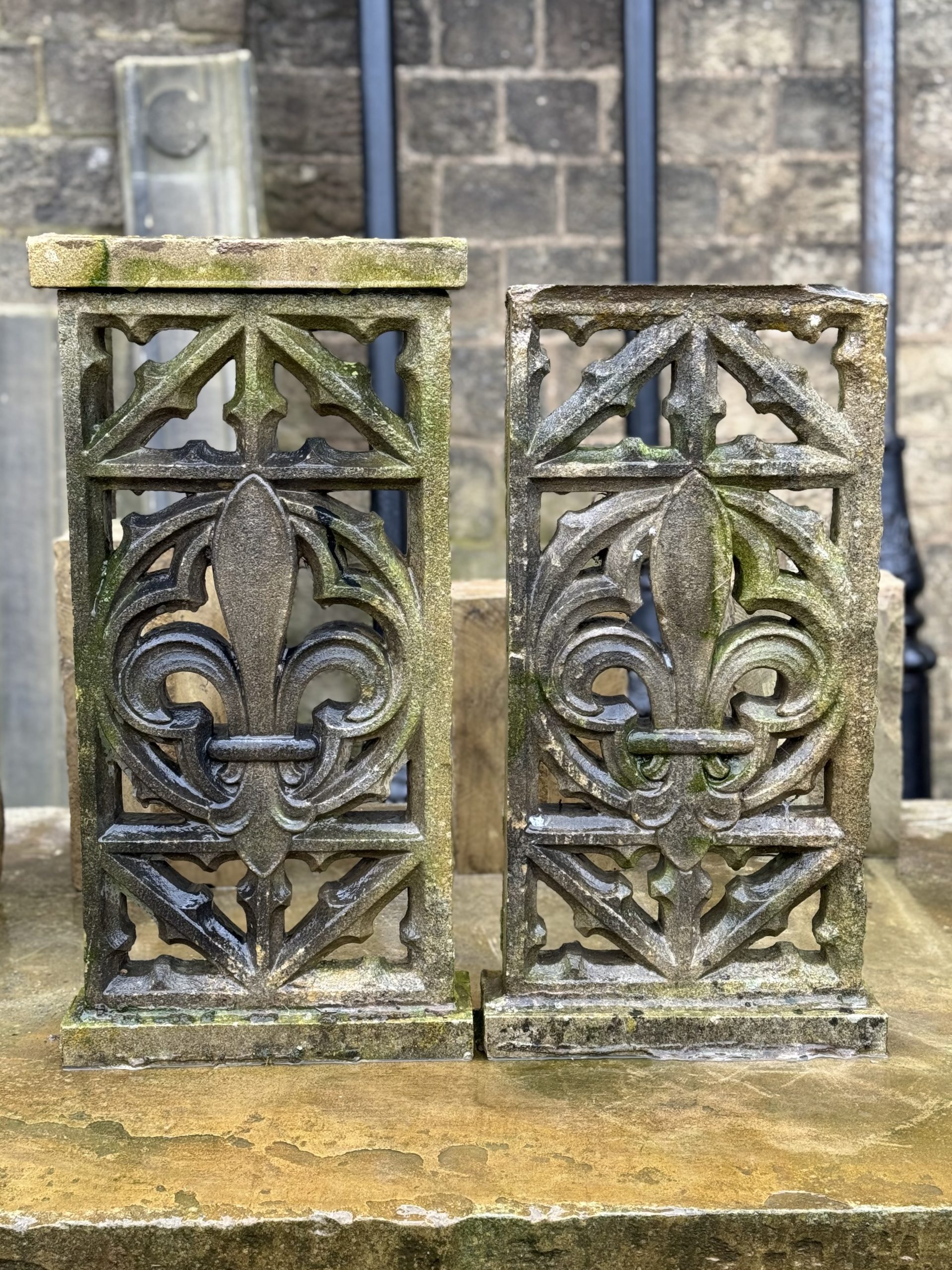 We have several of these very nicely carved stone flour de lis panels, possibly from inside a church or similar. Beautifully carved both sides. Dimensions as shown on photos.